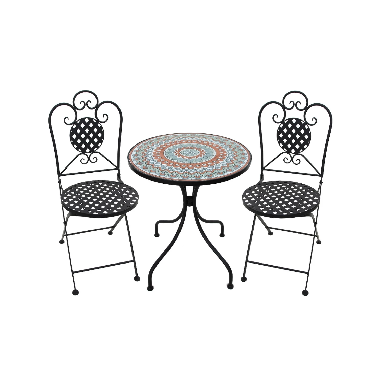 Elegant and classic design, this 3 piece mosaic bistro setting is a ideal addition to your garden or courtyard. Made from powder coated steel frame making it strong and durable. The table features beautiful mosaic tile design which is complimented by the curved legs and chairs. Easy to store the chairs fold flat when not in use.